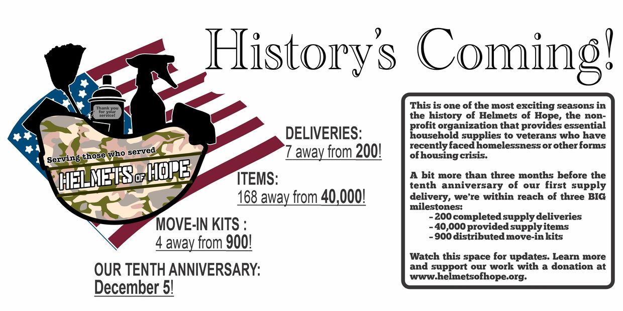 Helmets of Hope started in 2015 as a ministry of First Christian Church of East Moline, making its first supply deliveries in December 2015. In the two previous years, the church had collected personal hygiene products for the homeless veteran community in the Quad Cities, but then learned from the VA that essential household supplies were a more pressing need.